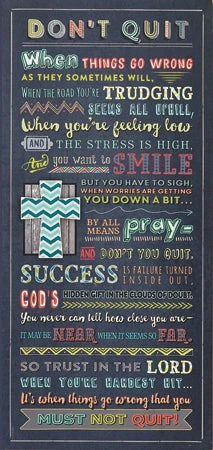 When things go wrong as they sometimes will, when the road you’re trudging seems all uphill, when you’re feeling low and the stress is high, and you want to smile but you have to sigh, when worries are getting you down a bit … by all means pray – and don’t you quit. Success is failure turned inside out, God’s hidden gift in the clouds of doubt. You never can tell how close you are – it may be near when it seems so far. So trust in the Lord when you’re hardest hit … It’s when things go wrong that you must not quit!