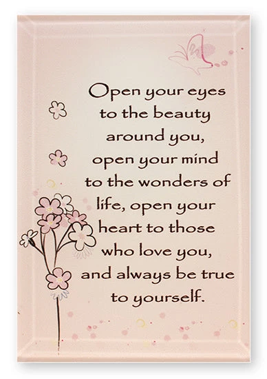 Reads ‘Open your eyes to the beauty around you, open your mind to the wonders of life, open your heart to those who love you and always be true to yourself.’