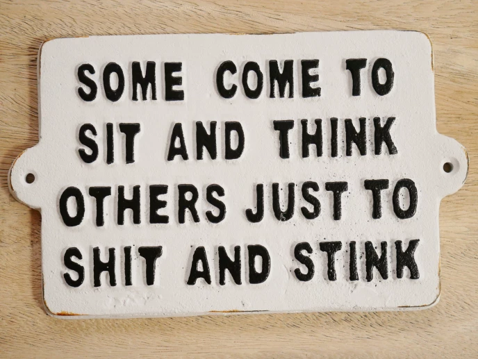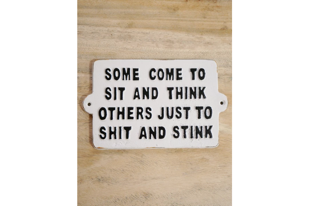 Crafted from solid cast iron and hand-painted in both black and white, this quirky sign featuring the humorous wording âSome come to sit and think others just to shit and thinkâ