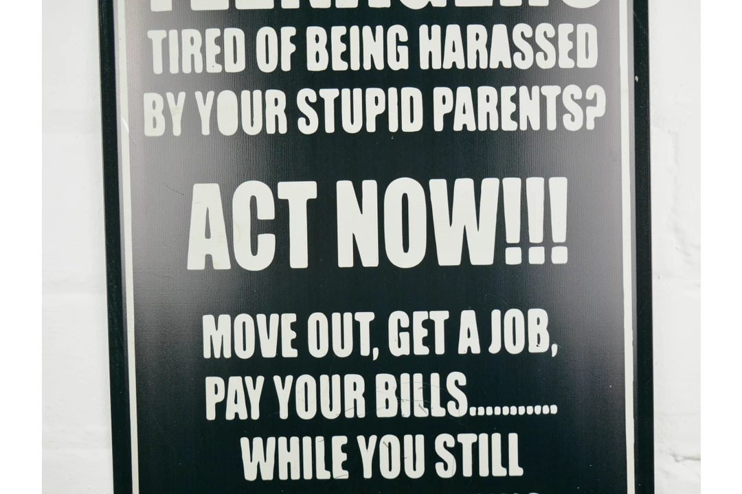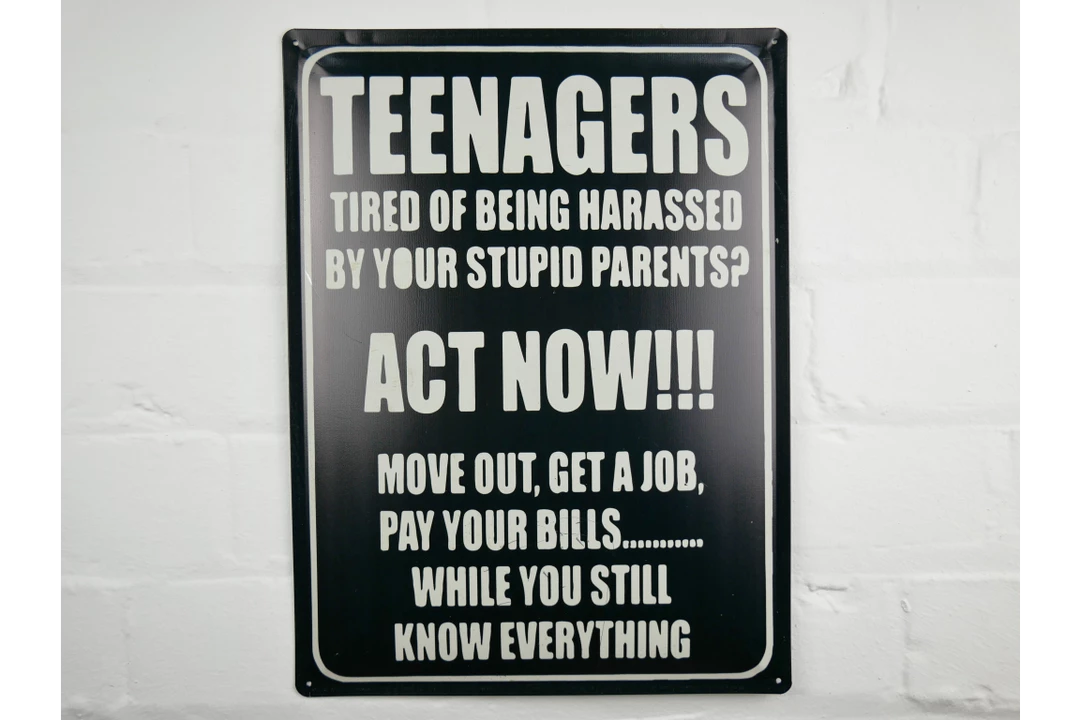 This metal teenagers sign is a fun, cheeky and comical sign ready to pre warn your teenagers of the grown up tasks ahead. Perfect gift or present for any parents with teenagers, also makes a great gift for any teenager with a good sense of humour. If you have teenagers that think they no better or could also do better, then this sign might therefore consequently be the reminder they need to put them off! Be sure to hang in pride of place to remind your teenagers the other life they could lead.