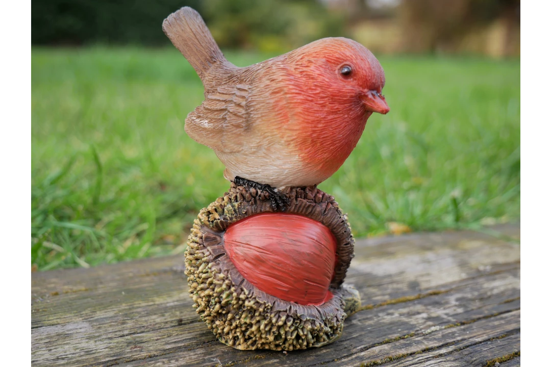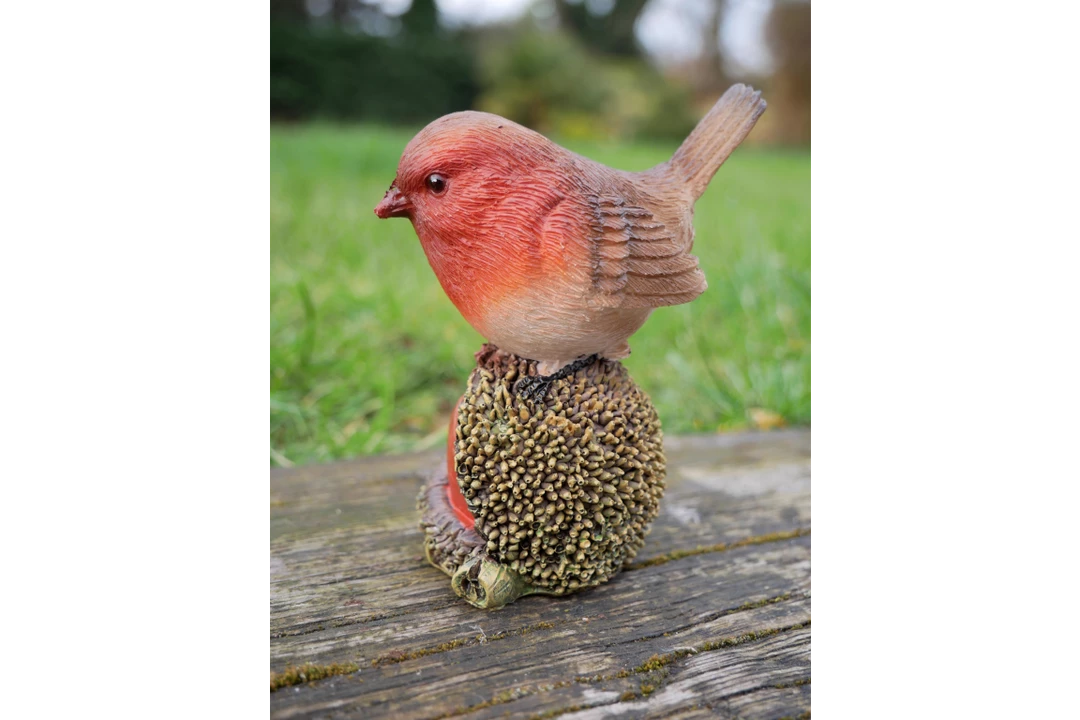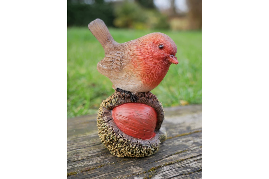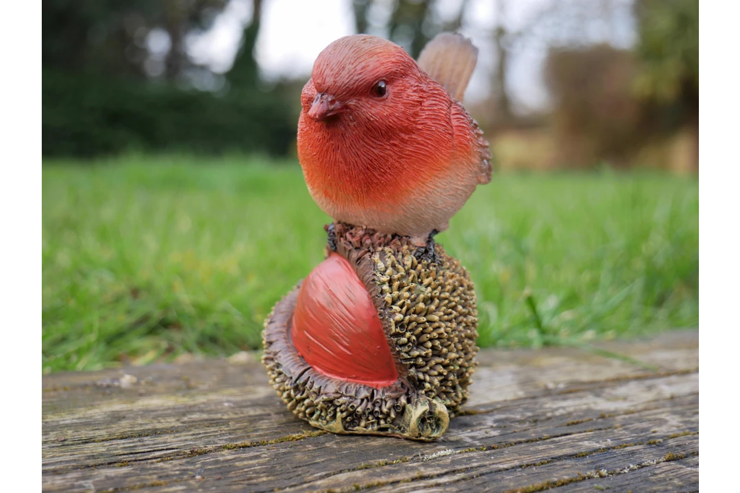 A delightful little robin, perched on a chestnut. The perfect way to bring new life to your garden, or give as an adorable gift.
