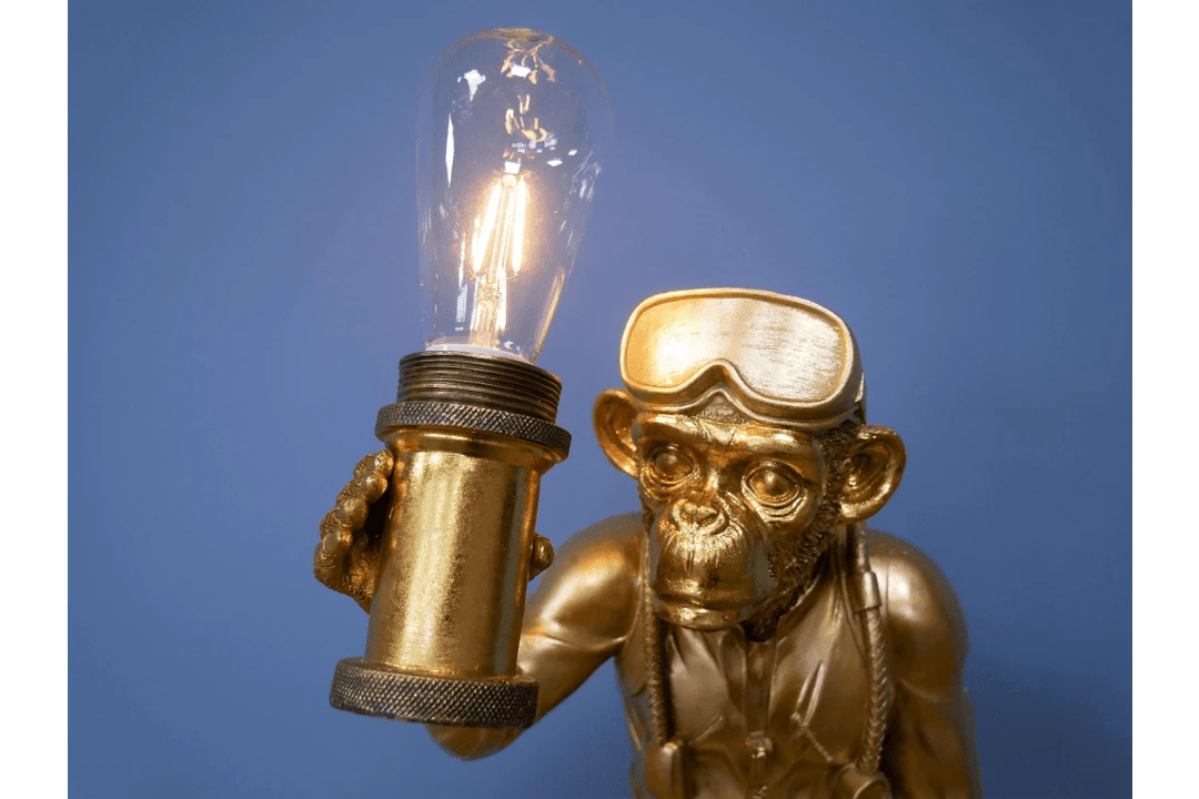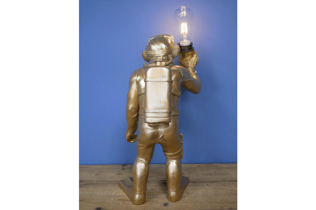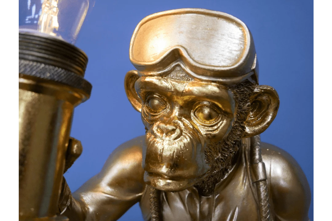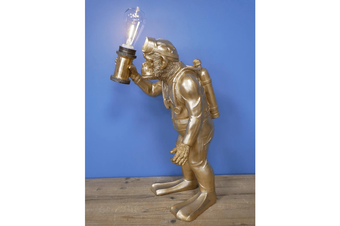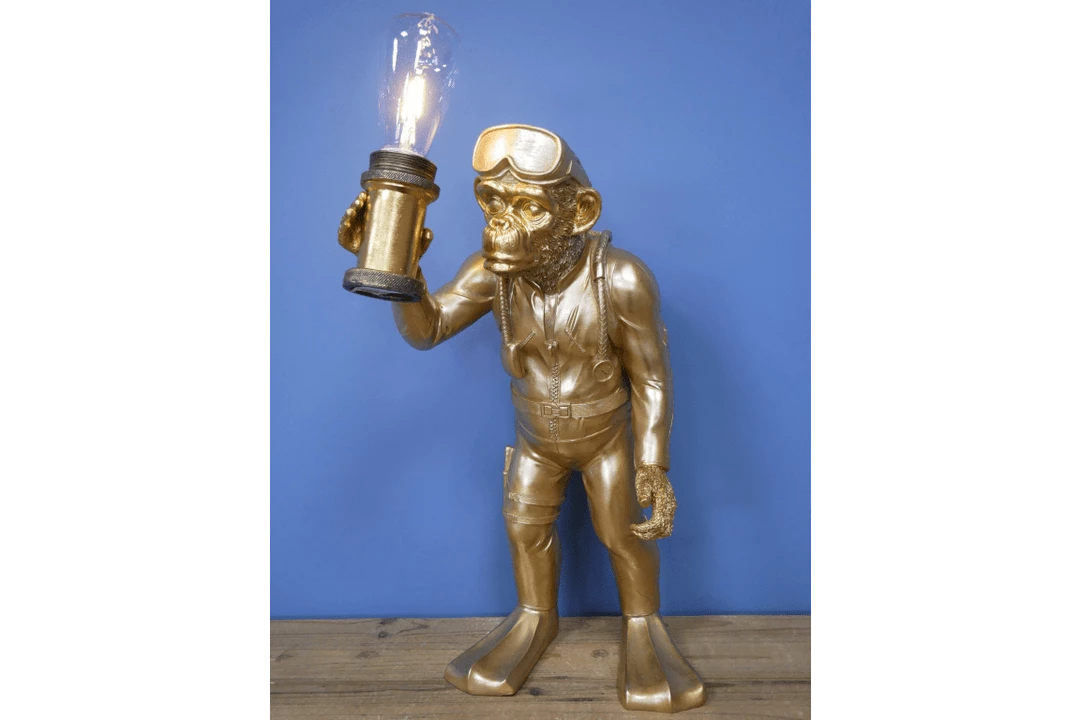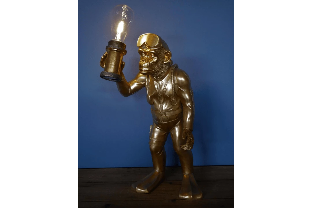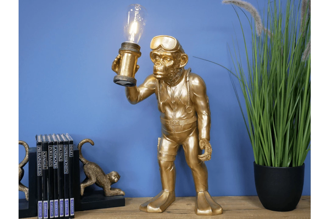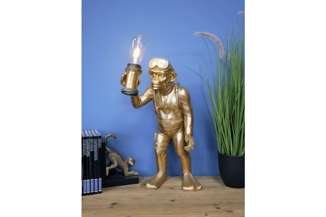 An eye-catching piece of art, the scuba Steve monkey table lamp in gold will inject an enchanting look wherever you choose to place it.