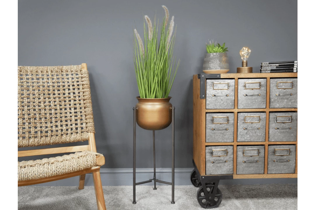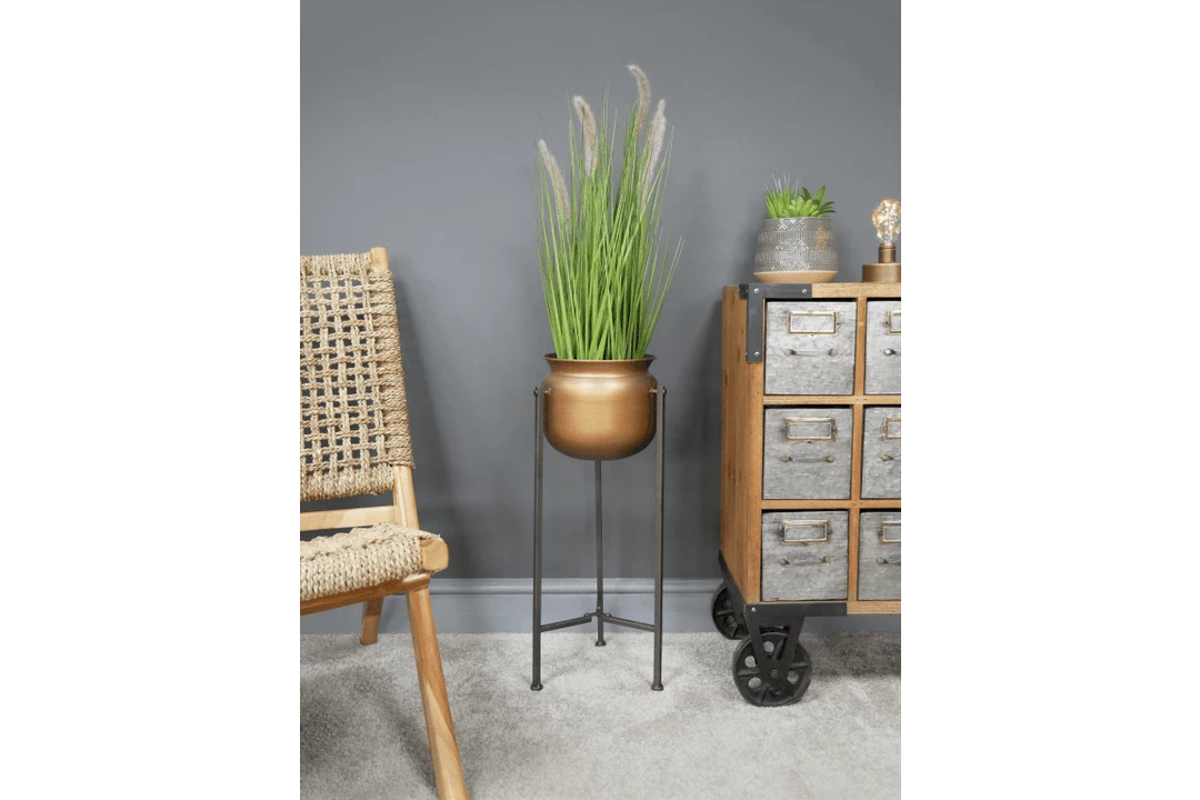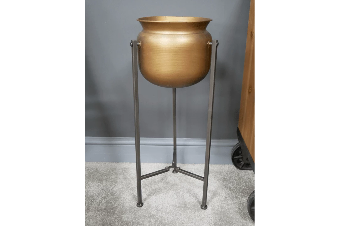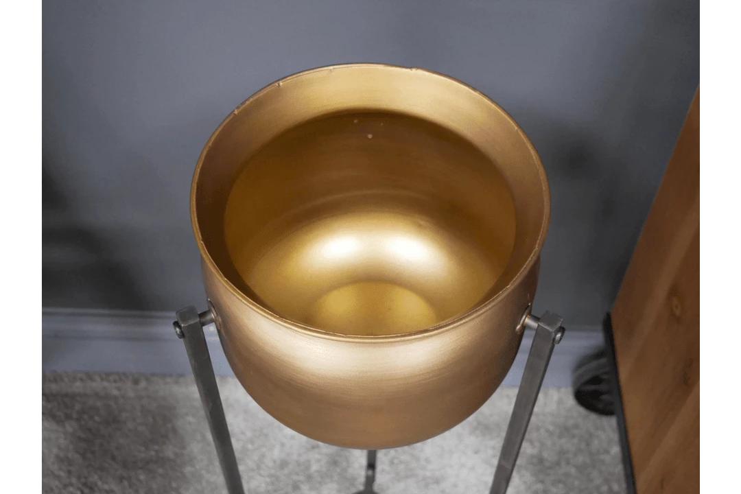 Glamorous tall freestanding plant stand with round gold pot. Ideal for indoor use and creating a botanical display. Due to its gold finish and simple design, this planter could blend into vintage or modern style spaces.