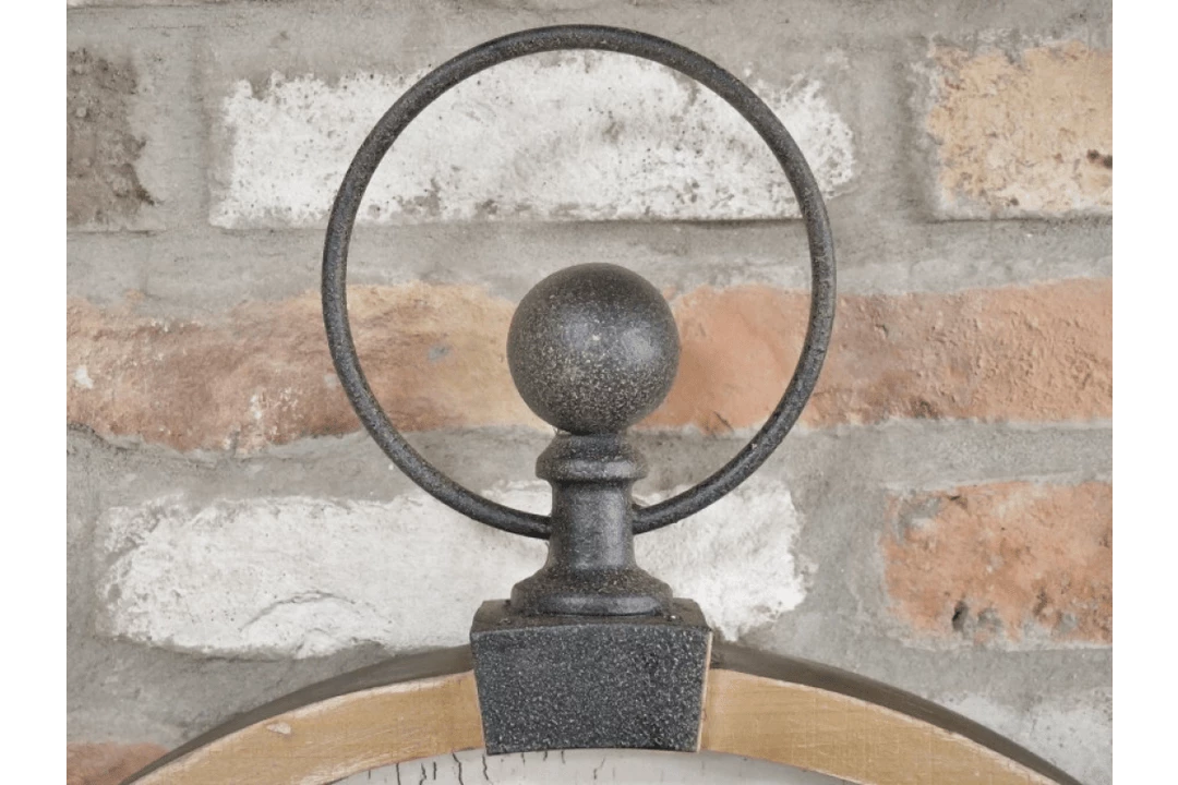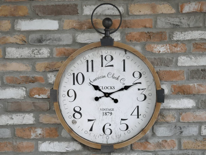 The American Clock Co. Pocket Watch Style Wall Clock Is a striking combination of vintage and modern design. Featuring an ornamental hook and numerical dial with a simple, visible typeface complemented by an ornamental hook, wood and iron frame with a distressed white clock face for a vintage look. With its classic pocket watch design and natural wood colour this wall clock will go with a variety of decors.