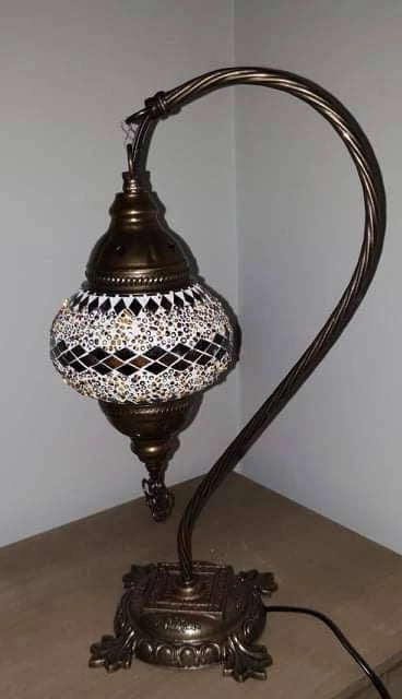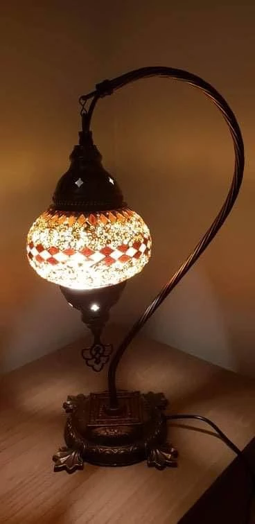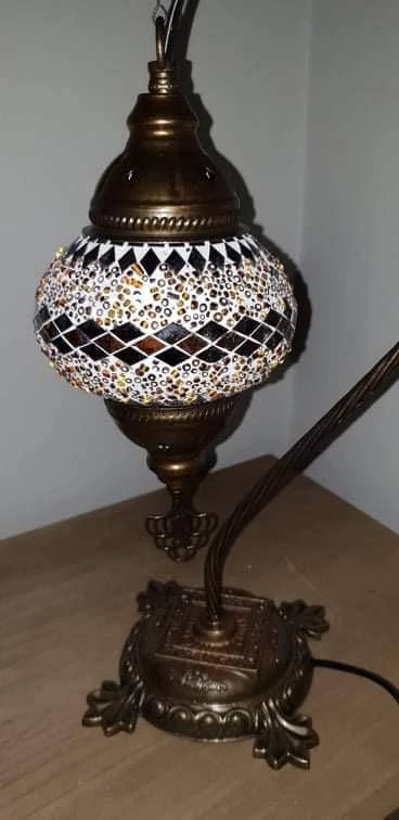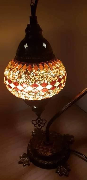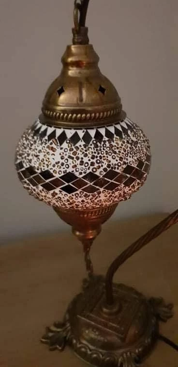 Bring a flair of traditional mosaic Turkish lighting into your home. Handcrafted by expert craftsmanship to create a unique lamp with multi-colours and geometric designs. Many coloured glasses are cut into small pieces and glued together to create a pattern. Individually made, no two are exactly the same, which is what makes this authentic Turkish Lamp very special. Finished with punched antiqued bronze metal accents on top and bottom of pendant. This beautiful lamp when lit reflects a gorgeous pattern on the wall.Light Bulb:
