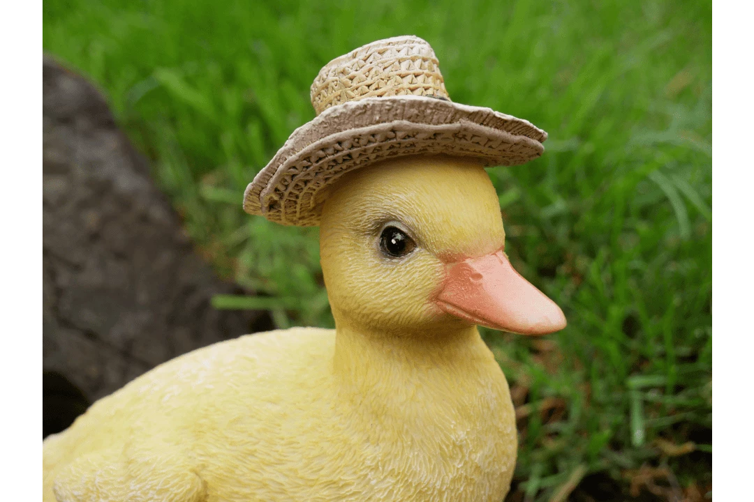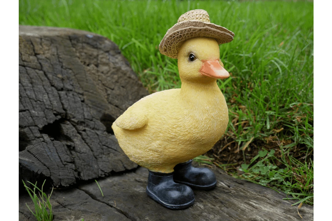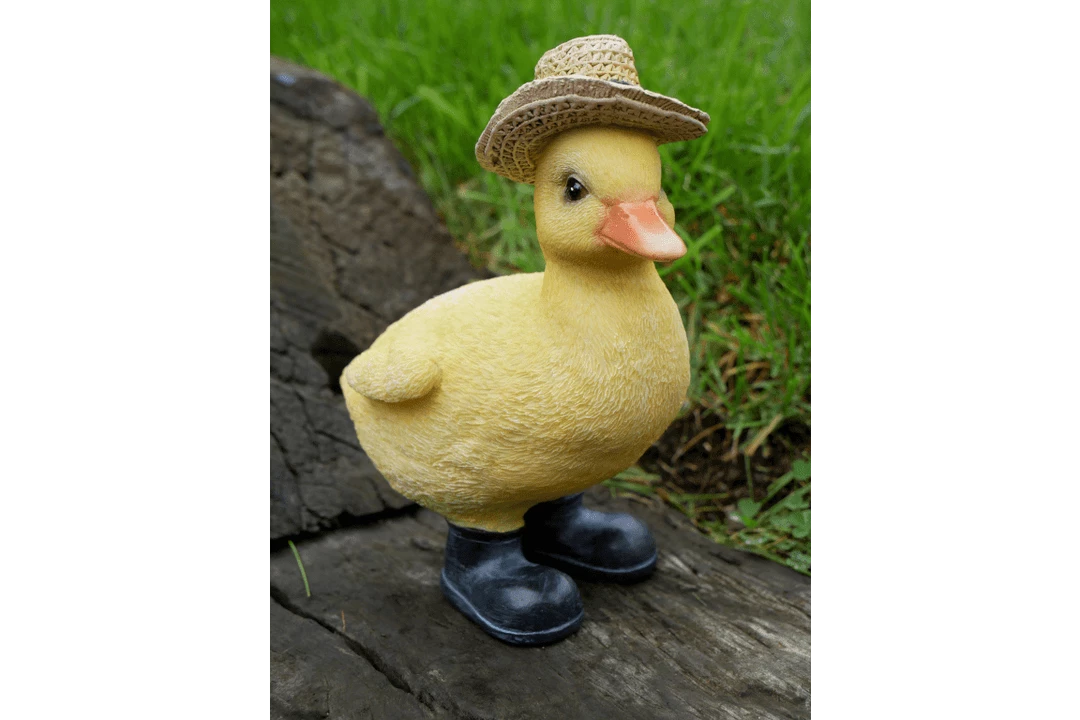 This adorable cheerful baby chick would make a great addition to any collection indoors or outdoors. Quirky, fun and whimsical wearing a hat and boots ready to splash happily in the elements.