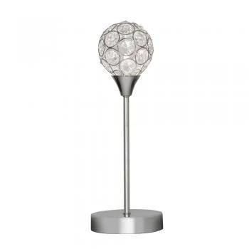 Let your living area have a touch of elegance with the Lana Table Lamp. Casting exquisite light patterns this glamorous silver-toned chrome table showcases a spherical silhouette threaded with open steel rings detailed with clear glass crystal jewels for a shimmering glow.