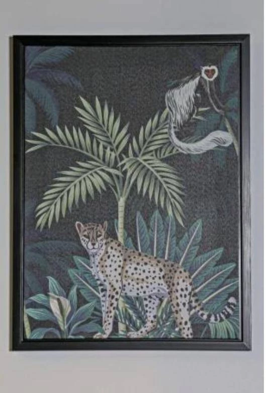 This botanical Canvas print, depicting palm leaves, a Wild Cat and Monkey is right on trend and makes a stunning addition to any home.