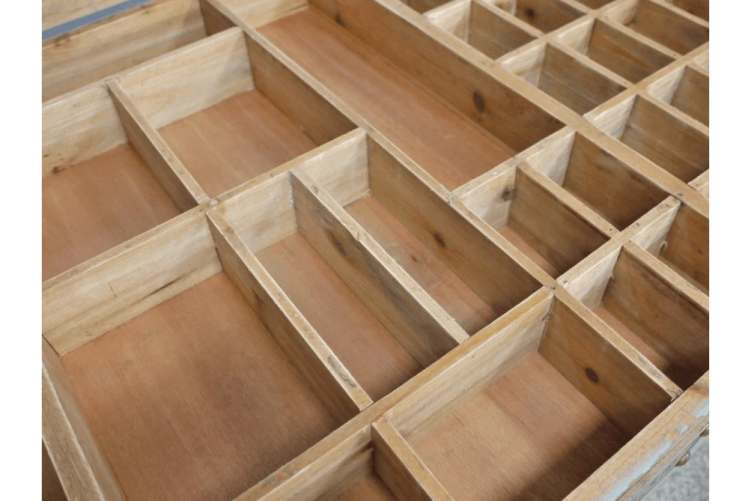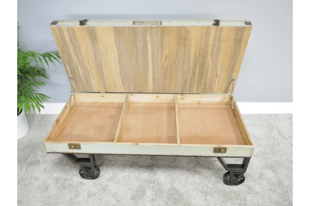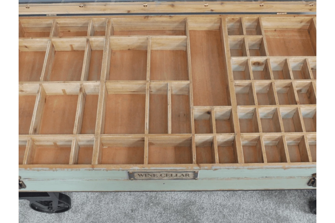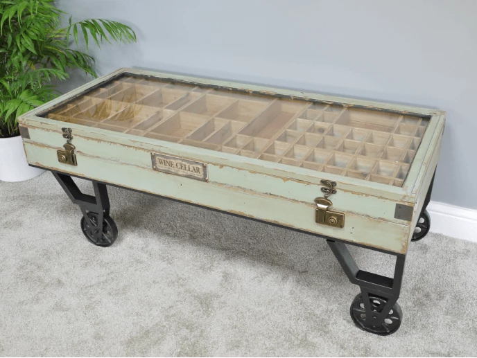 Gorgeous pastel coloured retro style Coffee table filled with many small compartments with lots of storage. The top has 2 layers, the top one filled with many small compartments, and a second hidden layer with 3 large compartments. A truly original Coffee Table feature that combines beauty with functionality.