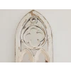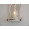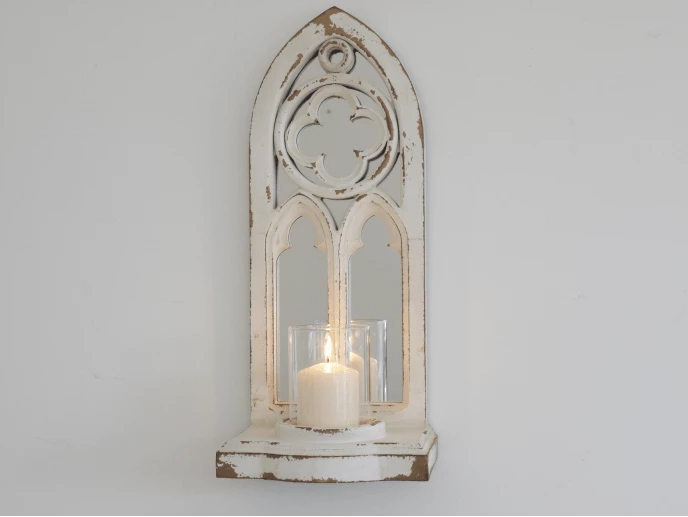 Attractive, distressed shabby chic Gothic arch mirror and candle holder. Featuring a glass hurricane lantern the effect of the candle flame dancing in the reflection of the glass is truly magical, and creates an inviting, cosy atmosphere in your home. Beautiful wall mounted church arch mirror candle holder.