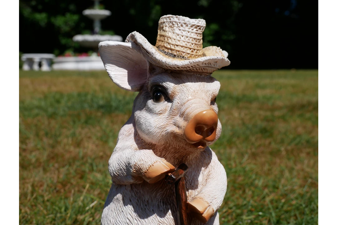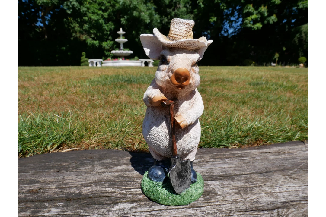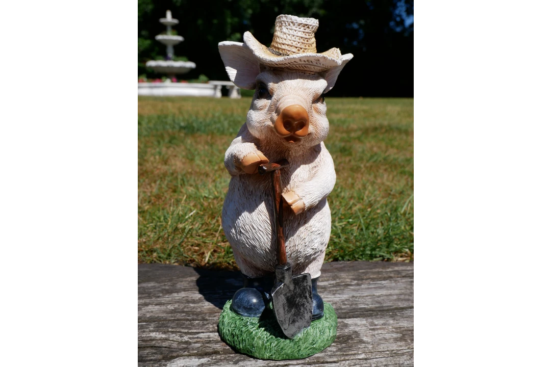 This this delightful sweet cute pig wearing a sun hat and holding a Spade would make a great gift or addition to your home or for someone that loves pigs!