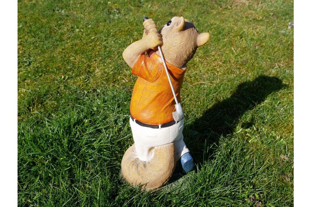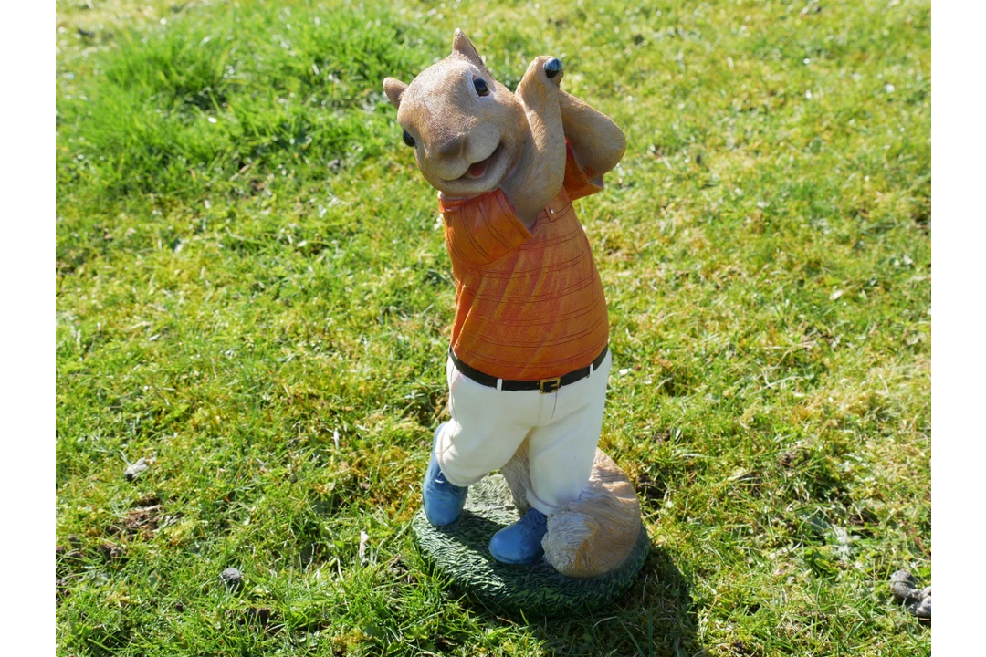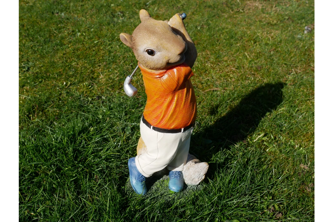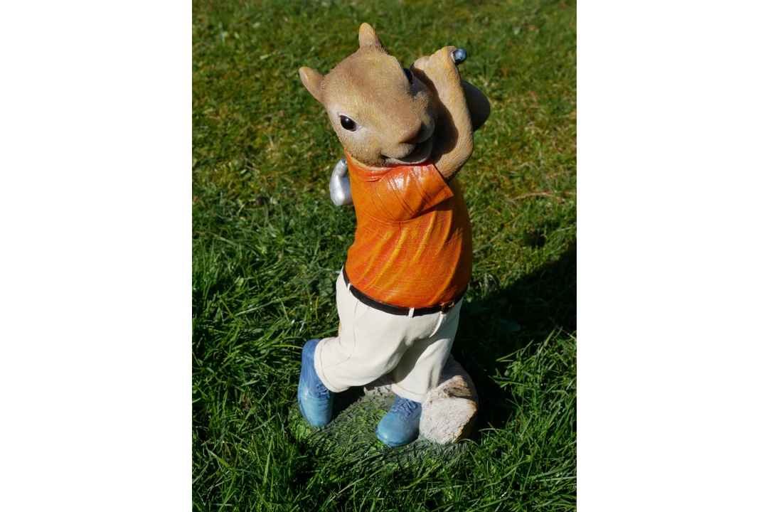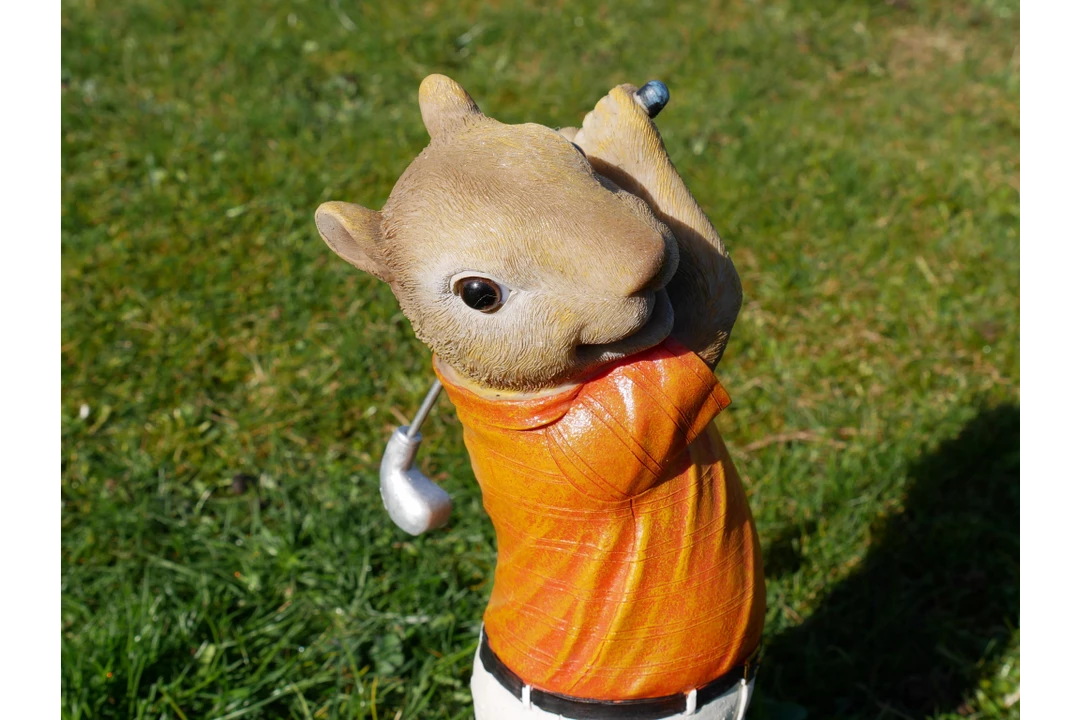 Meet Billy the Squirrel Golfer! A bright squirrel playing golf, wearing an orange and white golfers outfit and poised about to bat a ball!