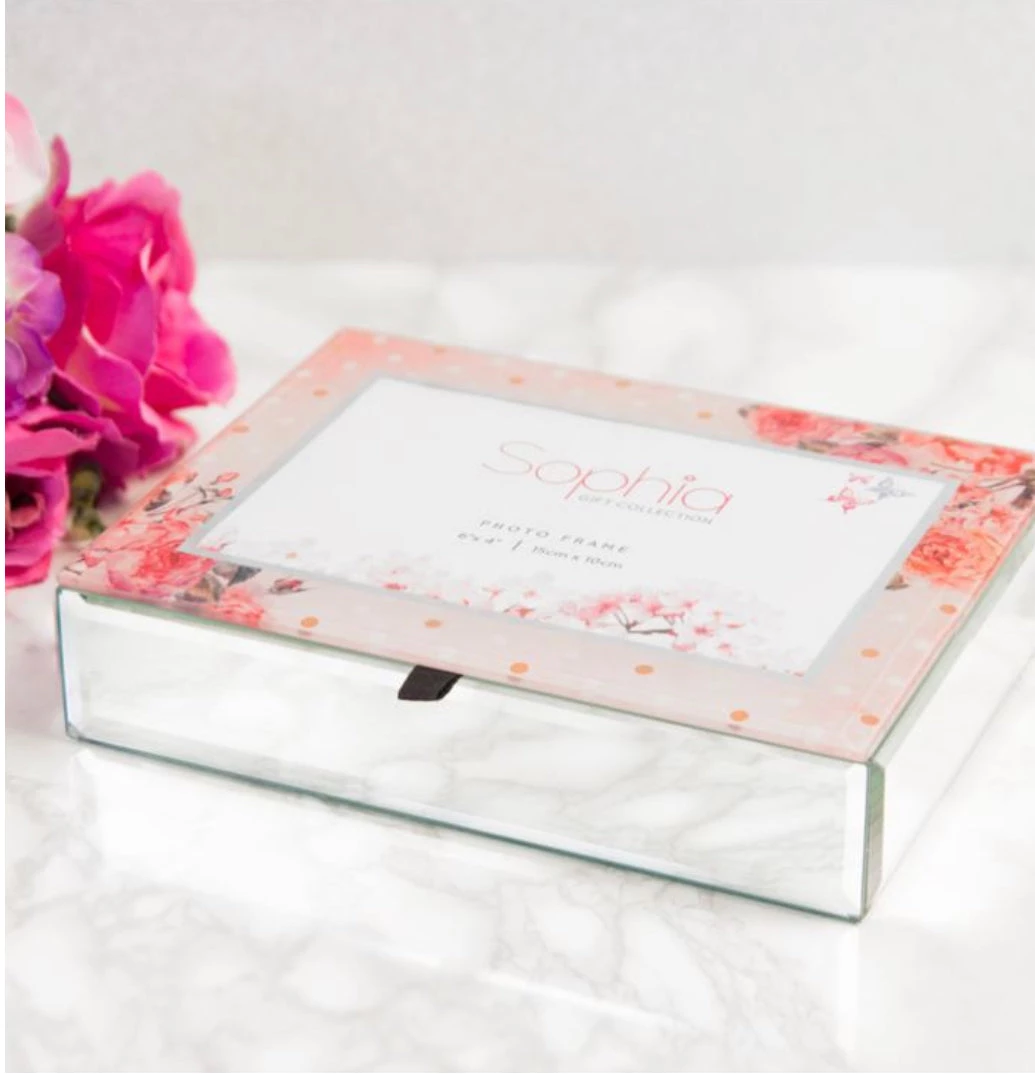 This jewellery box makes such a lovely gift whether for a loved one or for yourself! The lid of the mirrored glass box features an attractive pink and orange floral print with a space for a 6″ x 4″ photograph in the centre. It opens up to reveal a plush lined space for storing small items of jewellery and makes a wonderful decorative addition to the home.