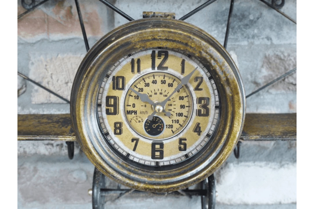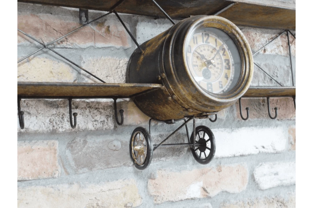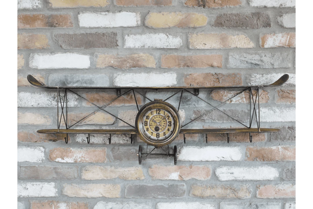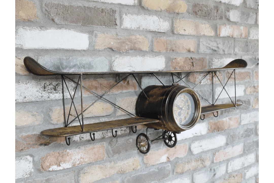 Stunning Rustic Finish Aeroplane Wall Clock. This unique clock has hooks under the wings and the wings can also be used as shelving. With the Attractive design of an aeroplane, this shelf not only adds practicality but also character to any room you decide to place it in.
