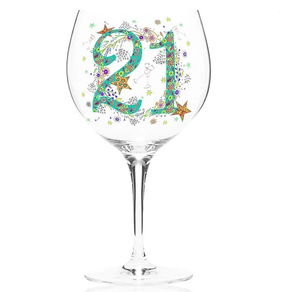 Happy Birthday Wine Glass – Time To Celebrate. Decorated in a floral and stars, on this wine glass which is perfect for a 21st birthday.