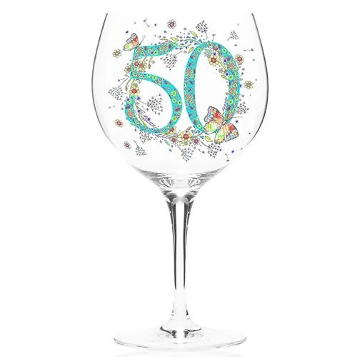 Happy Birthday Wine Glass – Time To Celebrate. Decorated in a floral and butterflies, on this wine glass which is perfect for a 50th birthday.