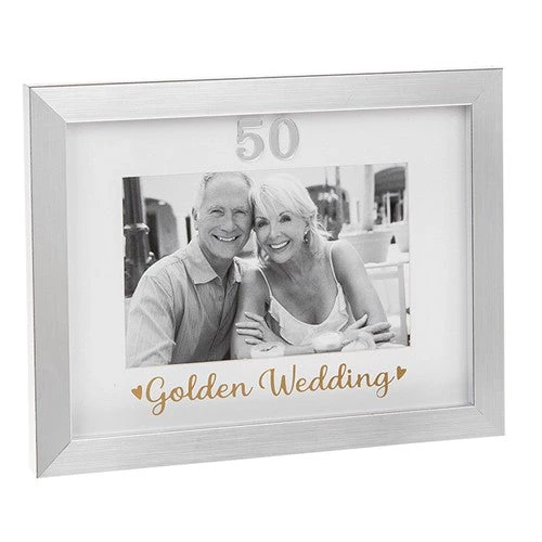 This Silver Wedding photo frame has a lovely mirrored 50 on the mount above the aperture. The title of Silver Wedding is foil embossed below with love hearts either side.