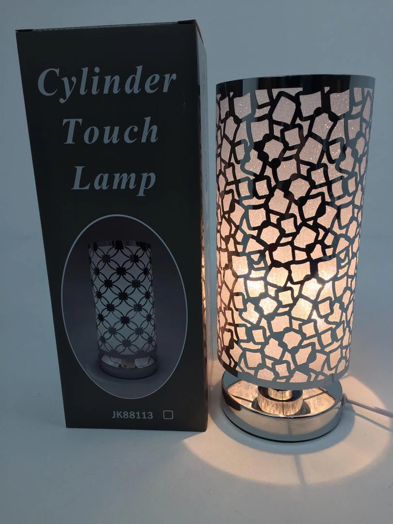 Cylinder decorative touch table lamp in a polished chrome finish The touch-sensitive base lets you to turn it on and off easily.
