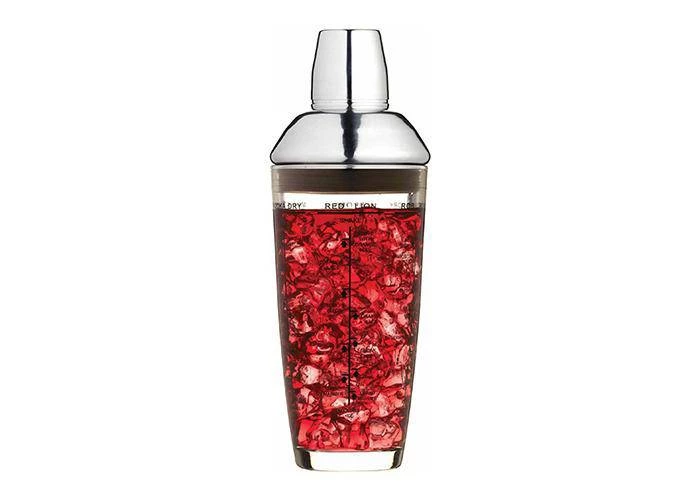 Impress your guests by serving delicious cocktails using this stylish Boston cocktail shaker with stainless steel cup, collar and lid and a contrasting glass base. Features handy mix-to the-line cocktail recipe markings on the outside, ideal for making your favourite cocktails. Recipes include Martini Dry, Rob Roy, Red Lion, Manhattan, Bronx and Vodka Dry.