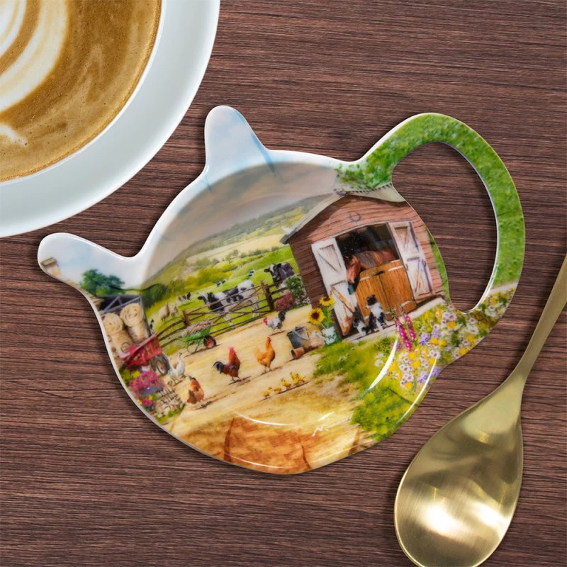 MacNeil design of a charming Farmyard Scene with a Horse, Tractor, Collie Dog and Hens. Beautiful hand-painted watercolour illustrations of farmyard animals Tea Bag Tidy. It would look truly stunning in any farmhouse or kitchen.