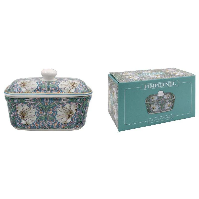 This butter dish is large enough for keeping everyday butter with its lid that fits neatly on top helping to keep butter fresh and safely stored. Made from Fine China Decorated in stunning floral Teal Pimpernel Art Textile by William Morris.