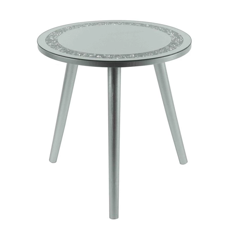 Sure to add a glitzy statement to any home space, a tall 3 legged table with a rounded shaped mirrored glitter top