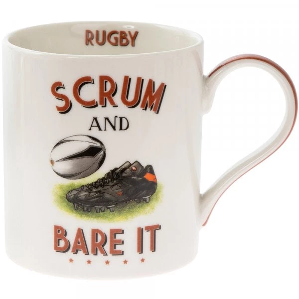 A fun white mug which has the words ‘Scrum and Bare it’ on it in bold lettering on the front and back. There is also a picture of Rugby boots and a football. The word Rugby is on the inside of the mug. Supplied in a picture box making it an ideal gift. Mug is dishwater and microwave safe.
