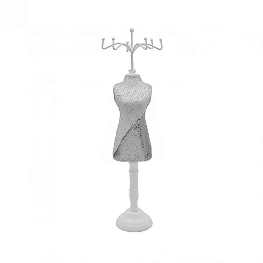 Chic and glamorous mannequin style jewellery stand suitable for storing and displaying pieces of jewellery including necklaces, bracelets and rings. Made from wood and covered with velvet fabric when brushed the sequins give a silver or white finish. Ideal for bedside cabinets and dressing tables.