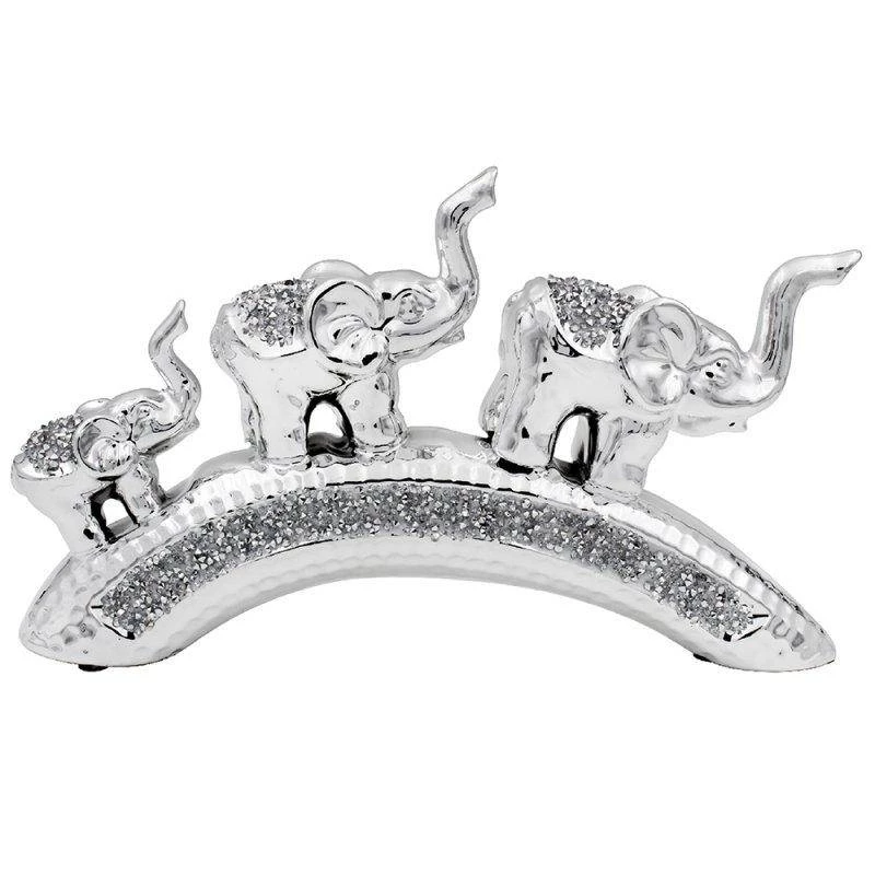 Three majestic elephants on an arch standing with trunks raised. This eye-catching elephant ornament is shiny and silver in colour, with texture and sparkle detailing. This beautiful elephant would be ideal in any room of your beautiful home.