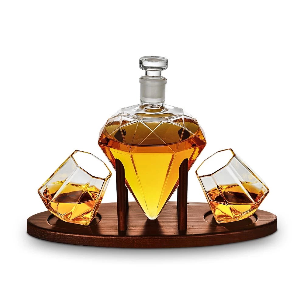 The Deluxe Diamond Decanter Set is a new addition to Mikamax’s decanter line. The luxurious carafe has a capacity of 850 ml and is made of crystal clear glass which is lightweight and durable. The decanter set comes with a sturdy wooden plateau which is engraved to hold 2 diamond-shaped whiskey glasses in place. Pouring your drink with the Deluxe Diamond Decanter Set will be even more enjoyable.