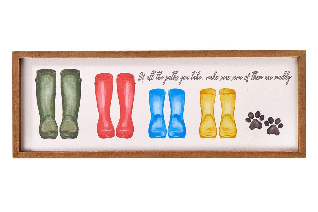 A lovely wooden wall plaque featuring family welly and paw print design “Of all the paths you take, make sure some of them are muddy”