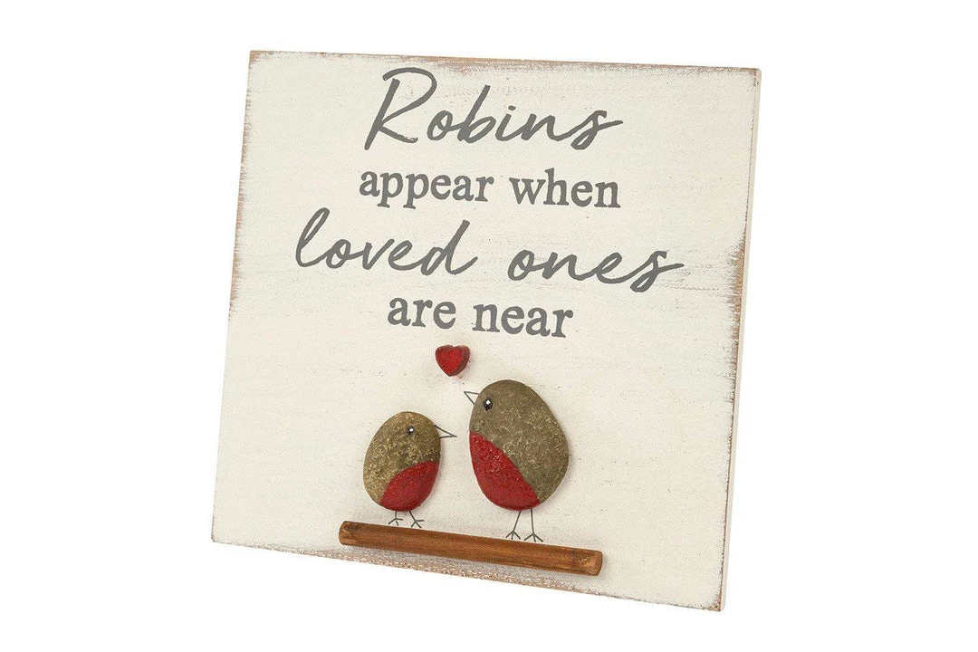 The robin is the commonest bird recorded in Irish gardens. Many believe they have been given signs that their relatives are still around which makes this Robin Plaque a beautiful sentiment Gift. Ivory wooden plaque with painted Robin and saying ” Robins appear when loved ones are near”