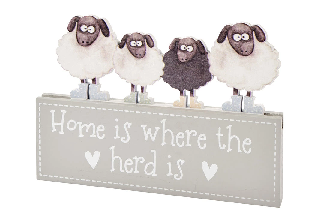 Family Sheep Herd Plaque – ‘ Home is where the herd is ‘ A wonderfully cute plaque to embrace family life. A wooden plaque painted grey with white script and four wooden sheep in boots with cute faces.