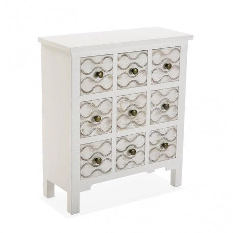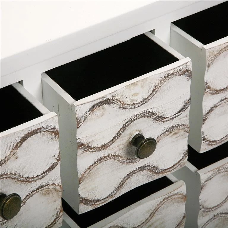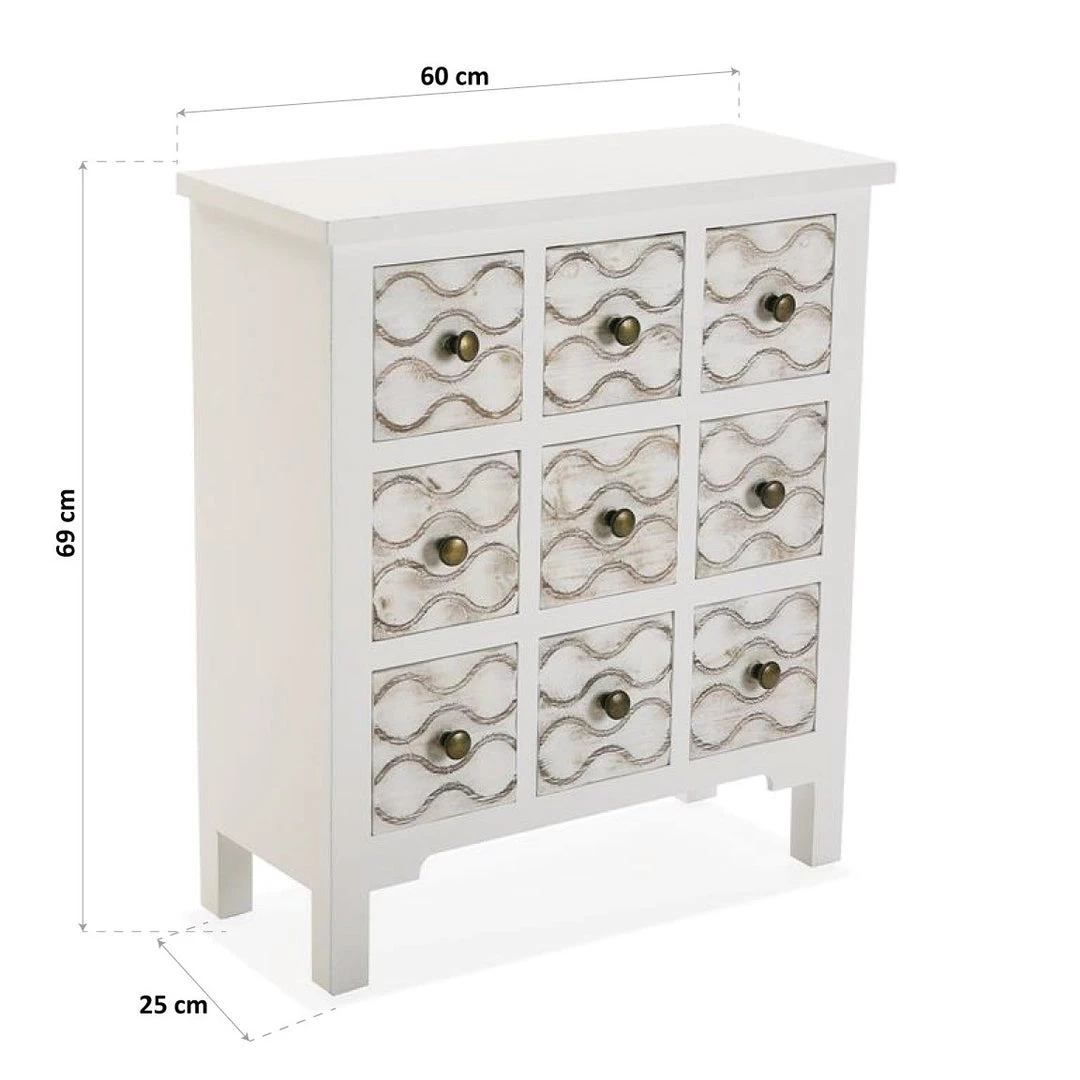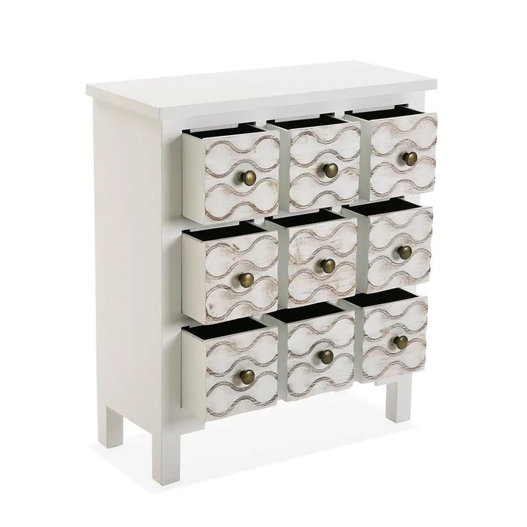 This stylish 9-Drawer Chest is the perfect piece for bringing homely style to any room offering plenty of storage. The cabinet features brushed strokes, decorating the drawer fronts and finished with brass drawer knobs. A modern twist on the vintage apothecary style storage chests.