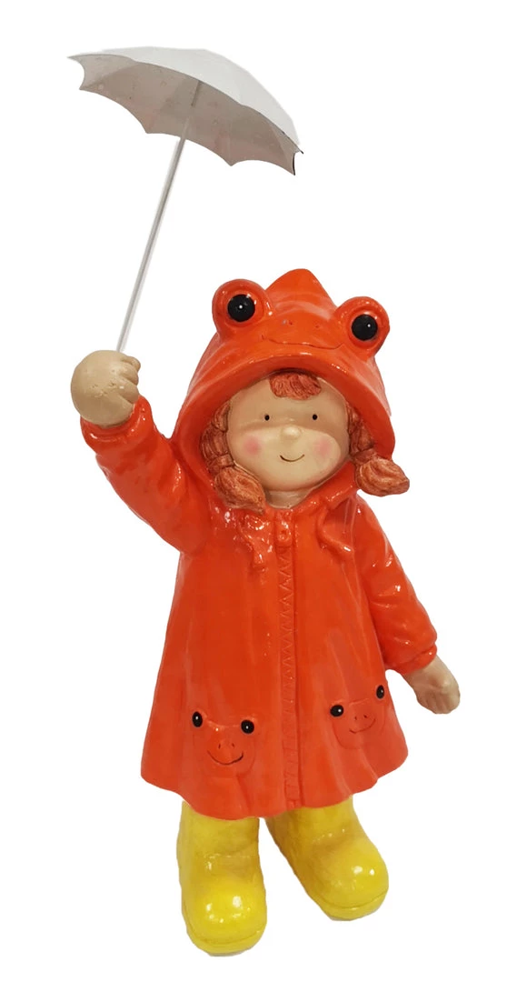 Add some whimsical charm to your outdoors with this delightful orange girl ornament. Dressed in a raincoat bright and colourful ready to make a big splash. This fun accessory truly is one of a kind and will be the perfect addition to any garden.